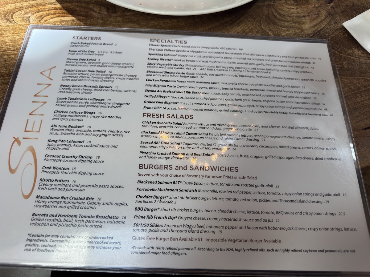 - Signature Dishes: Indulge in hearty options like the Grilled Ribeye ($52) or the Sienna Ale Braised Short Rib ($39), which showcase exceptional flavor and quality.